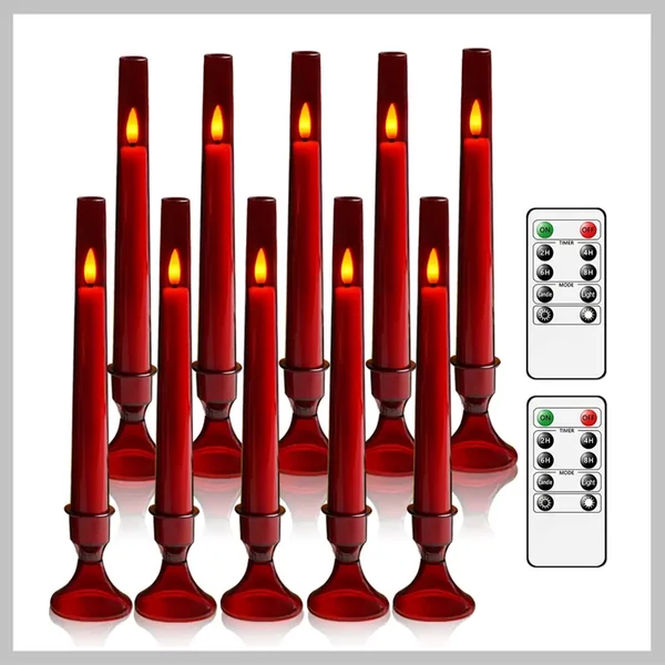 10 db Láng Nélküli Gyertya Dekorfény Távirányítóval és Gyertyatartóval - PIROS PX879351
