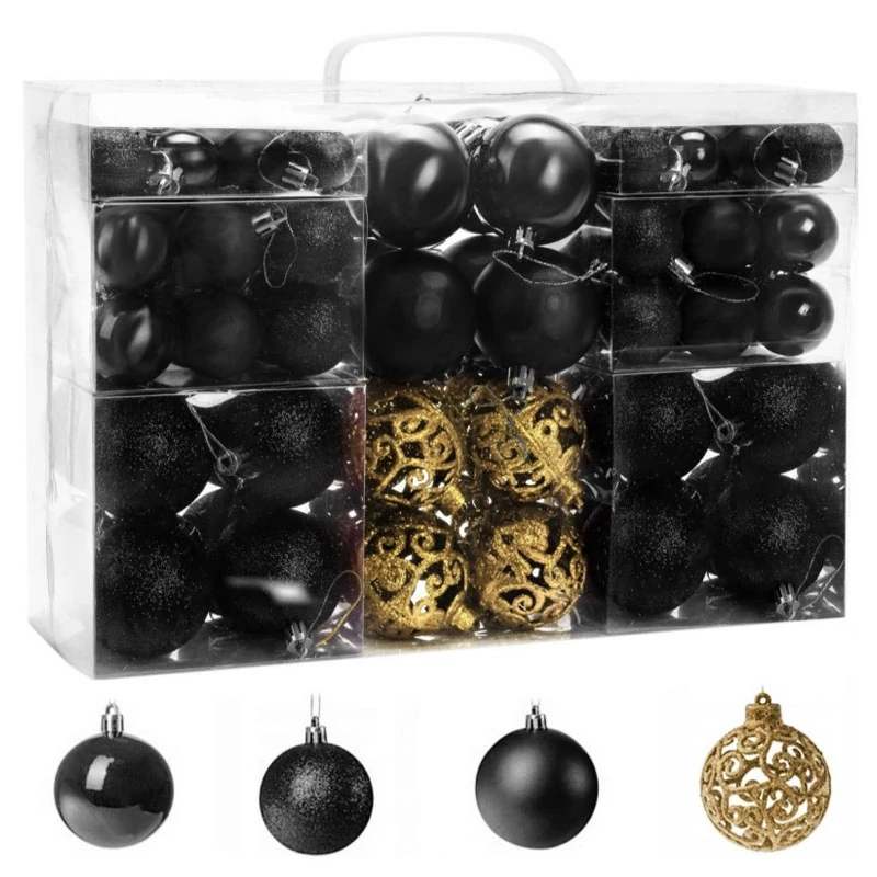 Tegye még különlegesebbé az ünnepi hangulatot ezzel az elegáns, 100 darabos fekete–arany karácsonyfadísz készlettel! A különböző méretű és felületű gömbök (matt, csillámos, áttört) harmonikusan illeszkednek egymáshoz, és modern, mégis ünnepélyes megjelenést kölcsönöznek a karácsonyfának.