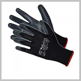 Poliészter alapú, csúszásbiztos kesztyű, szellőző kézháttal és gumírozott mandzsettával, érdesített tenyérrel, ergonómikus kialakítással, valamint a tenyerén nitril mártott!