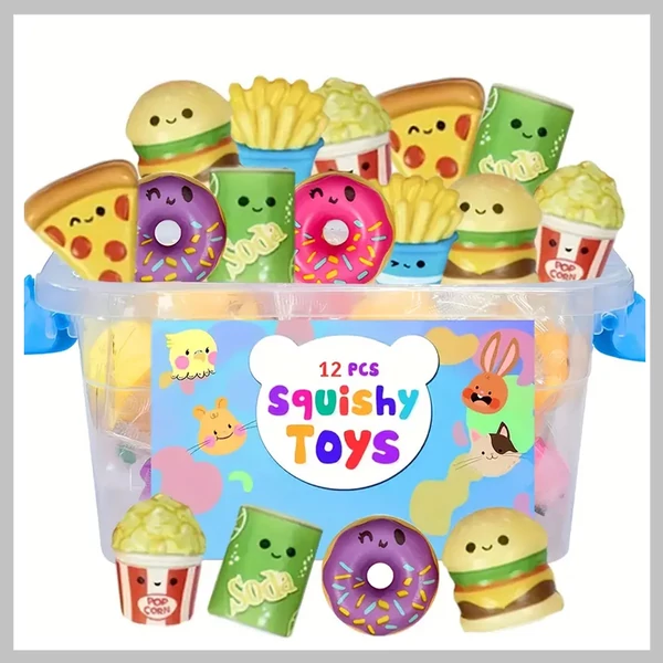 Ez a 12 darabos squishy játékcsomag tökéletes választás azoknak a gyerekeknek, akik szeretik a puha, nyomkodható, stresszoldó játékokat. A szett különféle aranyos gyorsétel formájú figurát tartalmaz – pizzaszelet, fánk, sült krumpli, hamburger, üdítős doboz, popcorn és még sok más –, ráadásul vidám arckifejezéssel ellátva.