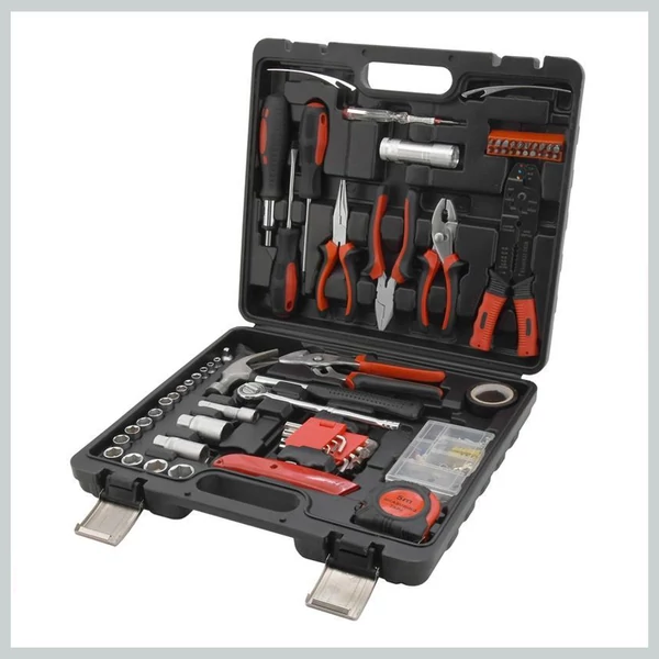 A HOUSE 159 részes szerszámkészlet egy átgondoltan összeállított, kompakt és praktikus megoldás minden háztartásba. A kiváló minőségű alap kéziszerszámok és a 92 darabos kötőelemkészlet egy helyen, jól rendszerezve található meg a masszív, hordozható műanyag kofferben.