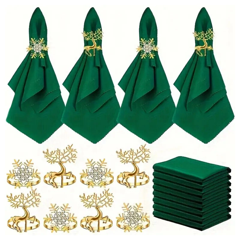 Ez a 16 darabos ünnepi asztali dekorációs szett elegáns és látványos kiegészítője lehet bármilyen alkalomnak. A zöld textil szalvéták és az arany színű, hópehely- és rénszarvasmintás szalvétagyűrűk tökéletesen illenek karácsonyi vacsorákhoz, esküvőkhöz, születésnapokhoz vagy más ünnepi eseményekhez.