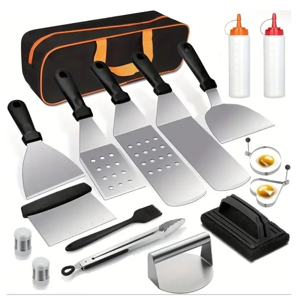 Ez a komplett sütő- és grillező szett tökéletes választás otthoni főzéshez, BBQ-hoz, vagy akár professzionális használatra. A csomag különböző méretű és formájú spatulákat, vágó- és szóróeszközöket, ecsetet, fém gyűrűket, tárolóedényt és szószos flakont tartalmaz – minden, ami egy hatékony és sokoldalú konyhai munkához szükséges.