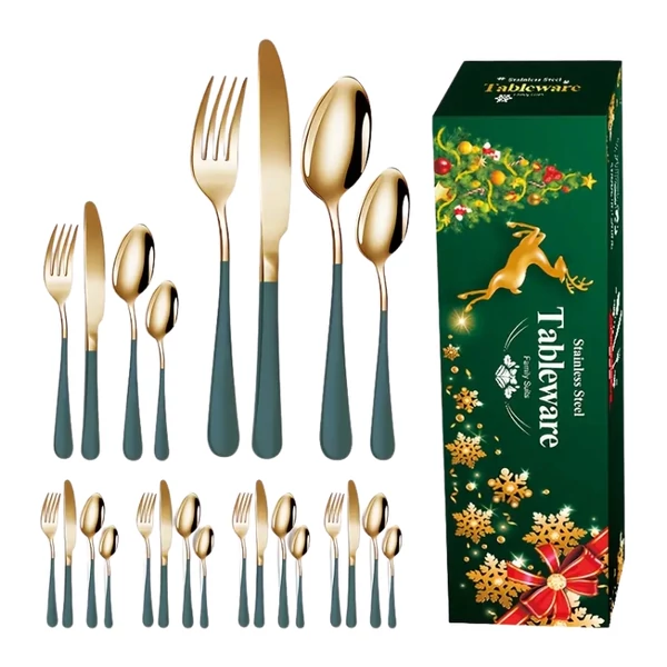 Elegáns és stílusos evőeszközkészlet, amely tökéletes választás mindennapi használatra és különleges alkalmakra. A modern zöld-arany színkombináció és az ünnepi díszdoboz különlegessé teszi, így kiváló ajándék is lehet karácsonyra, esküvőre vagy bármely családi eseményre.