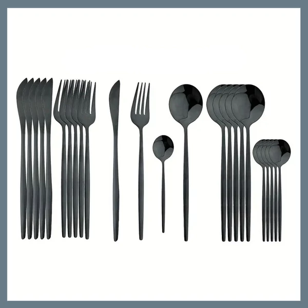 Ez a 24 részes evőeszköz készlet rozsdamentes acélból készült, fekete színű, modern dizájnban, amely egyedi és figyelemfelkeltő megjelenést biztosít az étkezésekhez. A készlet ideális választás bármilyen étkezési alkalomra, legyen szó hétköznapi étkezésről vagy ünnepi vacsoráról, és tökéletes kiegészítője minden modern konyhának.