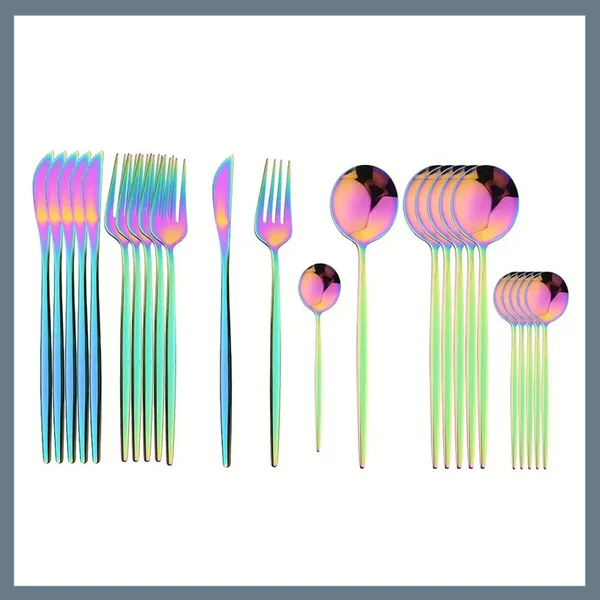 Ez a 24 részes evőeszköz készlet rozsdamentes acélból készült, szivárvány színű, modern dizájnban, amely egyedi és figyelemfelkeltő megjelenést biztosít az étkezésekhez. A készlet ideális választás bármilyen étkezési alkalomra, legyen szó hétköznapi étkezésről vagy ünnepi vacsoráról, és tökéletes kiegészítője minden modern konyhának.