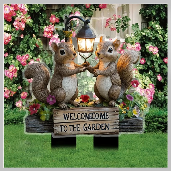 Dobd fel kerted vagy teraszod hangulatát ezzel a kedves, mókusos 2D akril üdvözlő táblával! A bájos állatfigurák, a fa deszka hatású háttér és a színes virágos részletek együttesen természetközeli, mégis játékos megjelenést adnak. Nincs szükség elemre vagy karbantartásra – egyszerűen szúrd le a talajba vagy helyezd el cserepes növények mellé, és élvezd a látványt!