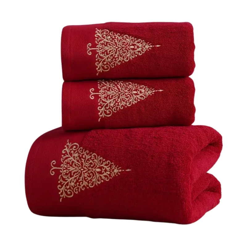 Szín: Ünnepi piros, arany hímzett karácsonyfa mintával