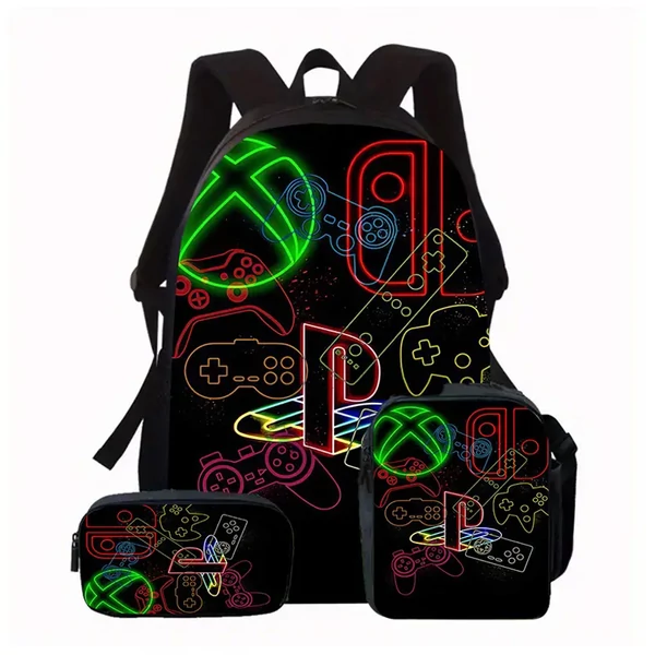 Ez a látványos, játékkontroller mintás 3 az 1-ben szett tökéletes választás iskolába, utazáshoz vagy napi használatra. A készlet tartalmaz egy nagy kapacitású hátizsákot, egy ebédhordó táskát és egy cipzáras ceruzatartót. A fekete alapon neon kontúrvonalas dizájn játékos, mégis modern stílust képvisel. Uniszex kialakításának és praktikus rekeszeinek köszönhetően minden korosztály számára ideális.