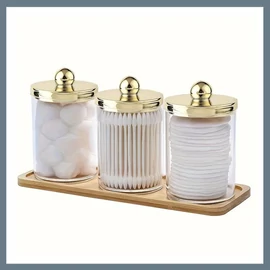 Rendezze be fürdőszobáját stílusosan és praktikusan ezzel a 3 darabos tároló készlettel, amely arany színű fedővel és tálcával rendelkezik. Az elegáns dizájn és a praktikus tárolóhelyek tökéletesek a mindennapi fürdőszobai kiegészítők rendezésére.