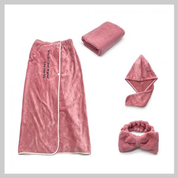 Tartalmazza a törölköző köpenyt kis törölközőt, a hajszárító törölközőt és fejpántot.