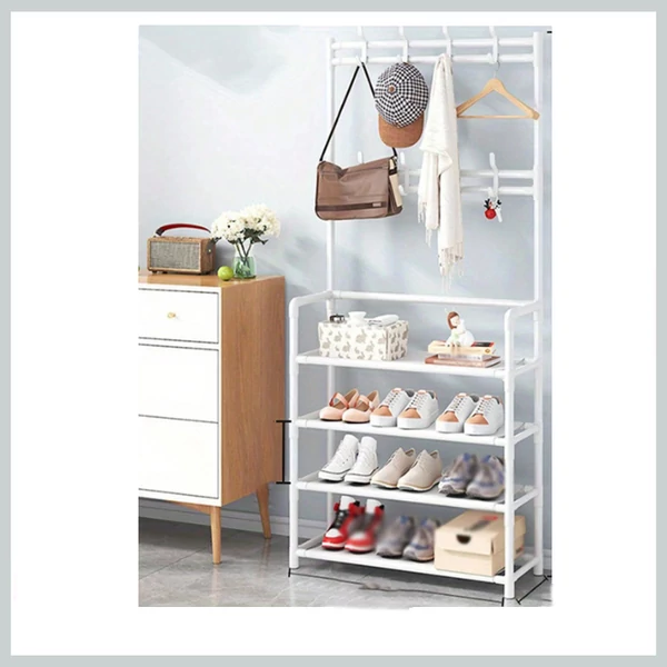 Ez a modern és funkcionális cipőtartó állvány tökéletes megoldás az előszoba rendezetten tartására. A négy polcos tárolórész elegendő helyet biztosít cipők, táskák és egyéb kiegészítők számára, míg a felső akasztók kabátok, sálak és táskák praktikus elhelyezésére szolgálnak.