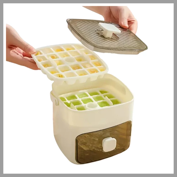 A jégkockaforma kétrétegű kialakításának köszönhetően további tárolóhelyet biztosít. Az elkészített jégkockákat az alsó tárolódobozba helyezheti, miközben további adagokat készíthet, így több ember igényeit is kiszolgálhatja.