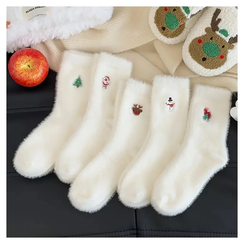 5 pár női karácsonyi bolyhos zokni – fehér, hímzett mintával QQ429362