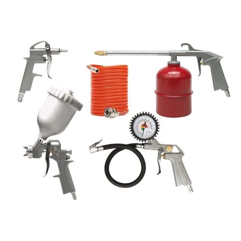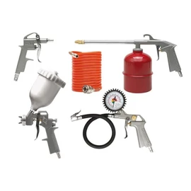 Sokoldalúan használható szórópisztoly készlet, amely festési, tisztítási és felfújási feladatokhoz egyaránt ideális. A működéshez sűrített levegő szükséges, amely biztosítja a hatékony és egyenletes működést.