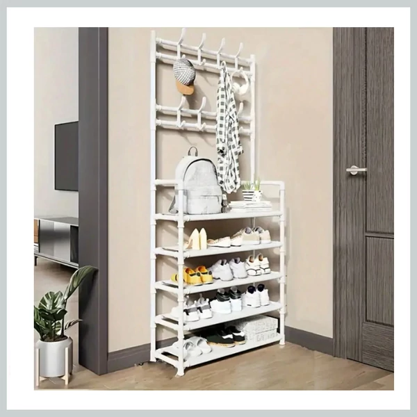Ez a modern és funkcionális cipőtartó állvány tökéletes megoldás az előszoba rendezetten tartására. Az öt polcos tárolórész elegendő helyet biztosít cipők, táskák és egyéb kiegészítők számára, míg a felső akasztók kabátok, sálak és táskák praktikus elhelyezésére szolgálnak.