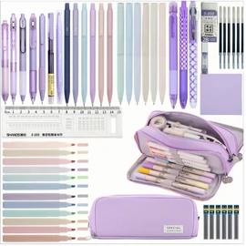 Ez a stílusos lila írószerkészlet tökéletes kombinációja a praktikumnak és az esztétikus megjelenésnek – bármilyen iskolatáskába vagy íróasztalra öröm elhelyezni.