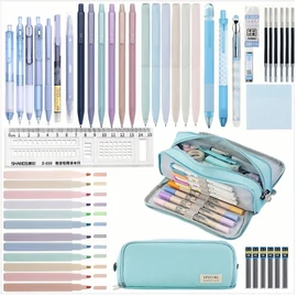 Ez az 50 darabos írószerkészlet praktikus és stílusos választás mindennapi tanuláshoz, jegyzeteléshez vagy kreatív munkához. A készlethez tartozó nagyméretű türkiz színű tolltartó rendszerezett tárolást biztosít, így minden eszköz átláthatóan és rendezetten elfér benne. A tollak és ceruzák letisztult, modern színei jól illeszkednek a harmonikus türkiz megjelenéshez.