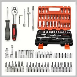 Ez az 53 részes racsnis szerszámkészlet ideális választás minden ezermester és járműtulajdonos számára. Tartalmazza a legfontosabb mélységű és szabványos 1/4", 3/8" és 1/2"-os meghajtású dugókulcsokat, valamint nyomatékkulcsot, racsnit, hosszabbítókat és speciális bitfejeket is, így tökéletes megoldást kínál autó- és kerékpárjavításhoz, valamint háztartási szerelési munkákhoz.