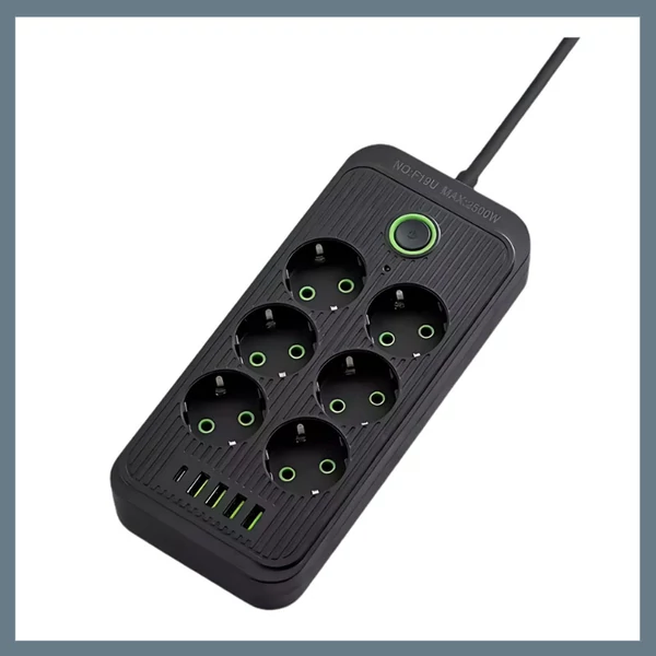 6 aljzatos hosszabbító, 3 USB + 1 Type-C porttal, 1.2m kábel, fekete F018U-BLACK Főbb jellemzők: 6 db EU AC aljzat – földeléssel, biztonságos csatlakoztatás nagyobb teljesítményű eszközökhöz 3 db USB port + 1 db Type-C port – gyors töltés, akár 2.1A kimenettel Maximális teljesítmény: 2500 W – alkalmas nagyobb energiaigényű eszközökhöz is Beépített főkapcsoló – egyetlen gombnyomással áramtalanítható Kábel hossza: 1.2 méter – ideális rugalmas elhelyezéshez Túláramvédelem és biztonságos működés Modern fekete dizájn zöld kiemelésekkel Kompakt és rendezett kialakítás
