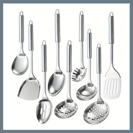 Ez a 9 darabos rozsdamentes acél konyhai főzőeszköz készlet minden alapvető konyhai feladatra tökéletes megoldást kínál. A kiváló minőségű rozsdamentes acélból készült eszközök nemcsak rendkívül tartósak, hanem modern, elegáns megjelenésükkel bármelyik konyha díszei lehetnek. A készlet tartalmaz spatulát, lyukas és hagyományos merőkanalat, szűrőkanalat, tésztaszedőt, és többféle szedő- és keverőkanalat, így a főzéstől a tálalásig minden lépéshez megfelelő eszközt biztosít.
