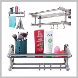 Fürdőszoba függő, elegáns polc ezüst színben. A polcon van egy tágas polc a kozmetikumok számára és két sín a törölközők számára Az egyik sínen négy akasztó található