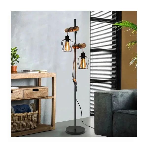 Ez a modern ipari stílusú állólámpa különleges hangulatot varázsol bármely helyiségbe. A fekete fém és a fa elemek kombinációja természetes és egyben loft hatású megjelenést biztosít, így tökéletes választás nappaliba, hálószobába vagy irodába.