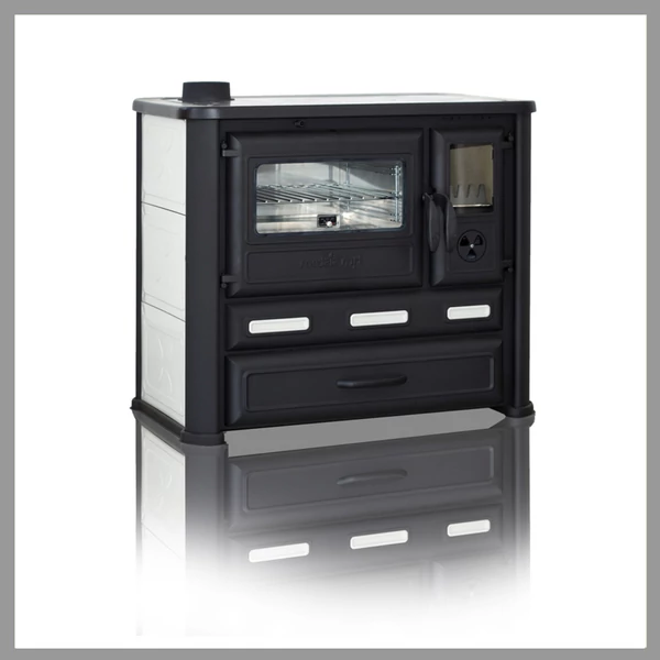 Exkluzív, elegáns formájú rusztikus fa tüzelésű fűtő és sütő-főző készülék. Klasszikus design, kiváló teljesítmény. Oldalt fehér zománcozott borítású a tűzhely, a sütője belül inox. Balos füstcső kivezetéssel rendelkezik a termék. A sütő mérete: 445x410x220mm