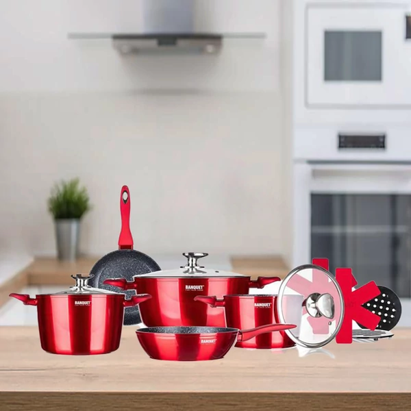 A METALLIC RED 12 darabos öntött alumínium edénykészlet a BANQUET-től tapadásmentes felülettel metálpiros külsővel, teljesen indukciós aljjal és bakelit fogantyúkkal rendelkezik, puha tapintású markolattal.