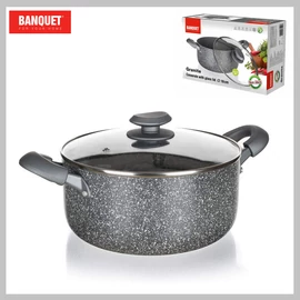 Alumínium préselt GRÁNIT rakott 18 x 8,5 cm tapadásmentes 2 rétegű felülettel gránit dekorban, szürke szilikon fogantyúkkal, üvegtetővel szürke szilikon gombbal és teljesen indukciós aljjal.