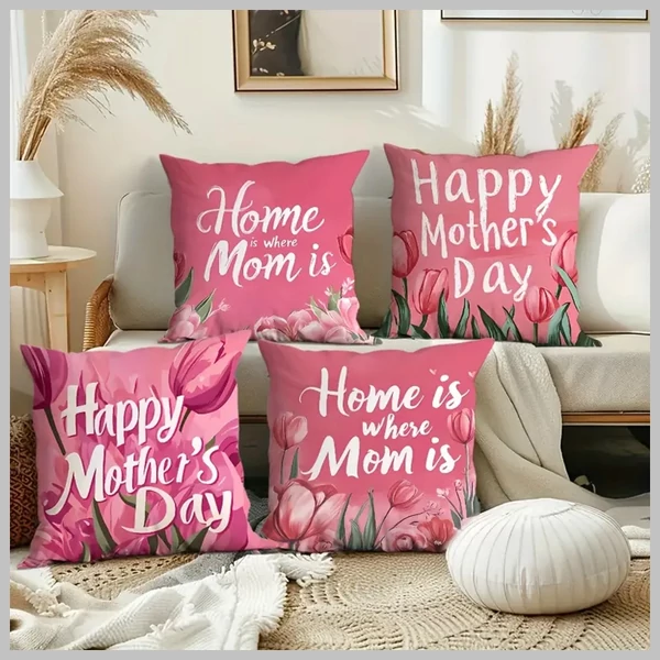 Lepd meg édesanyádat egy szívhez szóló ajándékkal, amely minden nap emlékezteti őt szeretetedre! Ez a 4 darabos dekoratív párnahuzat szett különleges Anyák napi hangulatot áraszt, rózsaszín árnyalatú virágmintával (tulipánokkal és szegfűkkel), valamint megható feliratokkal, mint például „Home is where Mom is” és „Happy Mother’s Day”.