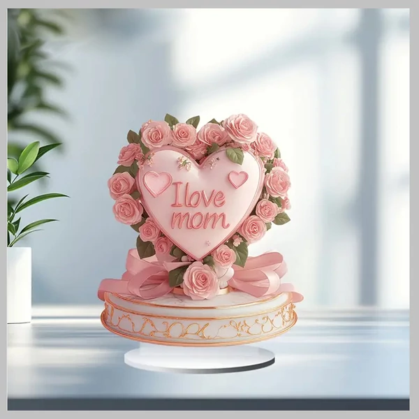 Különleges dizájn: A „I Love Mom” feliratú szív alakú dísz rózsaszín rózsákkal és finom szalagokkal díszítve, tökéletes Anyák napi ajándékhoz vagy más ünnepi alkalmakhoz.