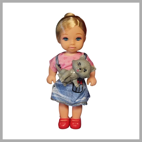 Ez a bájos 11,5 cm-es játékbaba ideális választás a szerepjátékot kedvelő gyermekek számára. A baba aranyos, részletgazdag öltözetet visel – farmermintás szoknyát és rózsaszín felsőt –, és egy elragadó kisállatot, egy kiscicát is tart a kezében, ami még színesebbé teszi a játékélményt.