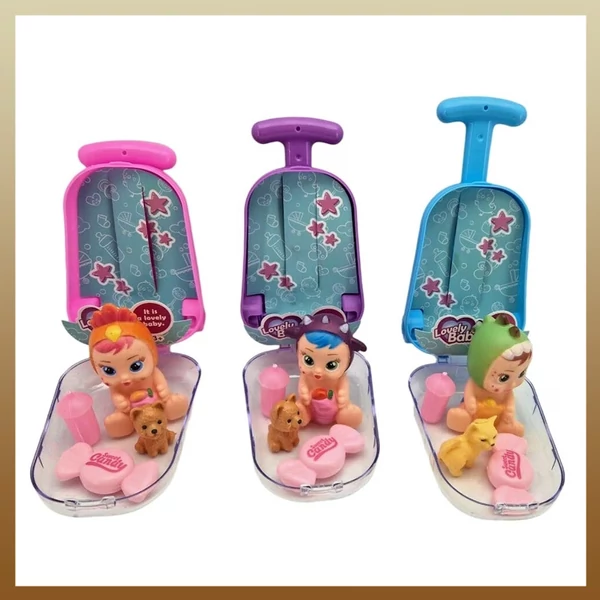 Baba kiegészítőkkel, kerekeken kofferban. Különböző típusú babákat, a készlet erejéig küldjük.