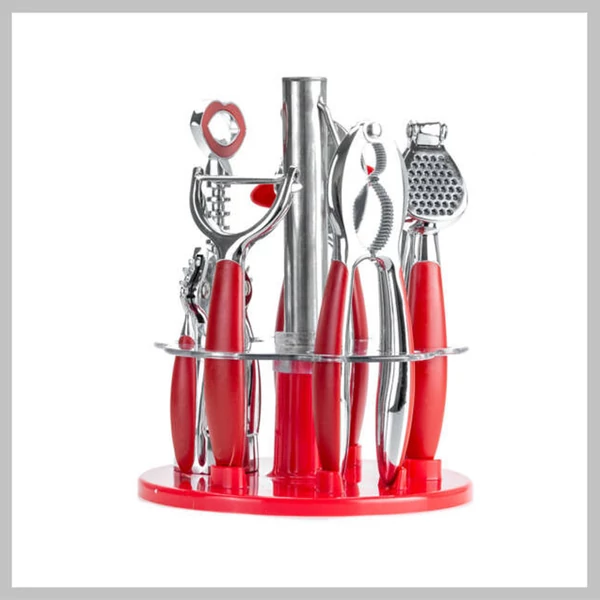 Ezekkel a rozsdamentes acélból és műanyagból készült konyhai eszközökkel garantált sikered lesz a konyhában, hiszen a gyártó összeválogatta neked a leghasznosabb konyhai kiegészítőket. A csomagban találsz egy darab diótörőt, egy darab fokhagymanyomót, egy darab dugóhúzót, egy darab konzervnyitót és egy darab zöldséghámozót. Tárolásáról az elegáns megjelenésű állvány gondoskodik, ami szép dísze lesz a konyhádnak.