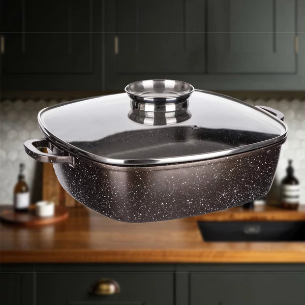 Prémium Sötétbarna öntött alumínium tepsi, 28 x 28 x 8 cm méretű, üvegtetővel, aromagombbal, 2 rétegű belső tapadásmentes felülettel, sötétbarna márvány szerkezetben. A tepsi márvány szerkezetű külső hőálló bevonattal van ellátva, beleértve az indukciós alját is, amely szintén hőálló bevonattal van bevonva.