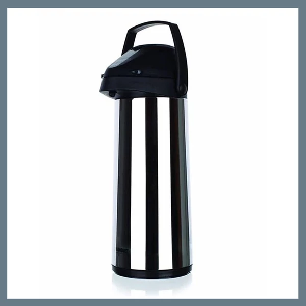 A termosz rozsdamentes acél palásttal rendelkezik, amely fényes felületű, míg a pumpás adagoló, fedél, fogantyú és talp műanyagból készül a könnyű kezelhetőség érdekében. Az üveg szigetelő betét biztosítja a hatékony hőmegtartást, így az italok hosszabb ideig megőrzik hőmérsékletüket.