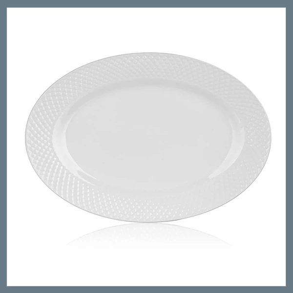 A BANQUET DIAMOND LINE ovális kerámia tányér elegáns, dombornyomott mintázattal rendelkezik, amely kifinomult megjelenést kölcsönöz az asztalterítéshez. Mérete 34,5 x 24,2 cm, így ideális nagyobb adagok, például főételek, sült húsok vagy köretek tálalására.