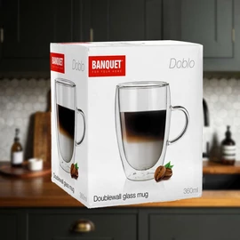 A DOBLO 360 ml-es duplafalú üvegbögre hideg és meleg italok felszolgálására alkalmas, valamint a két fal használatának köszönhetően a bögrében lévő ital tovább marad meleg, mint a hagyományos bögrékben. A bögrék mosogatógépben moshatóak.