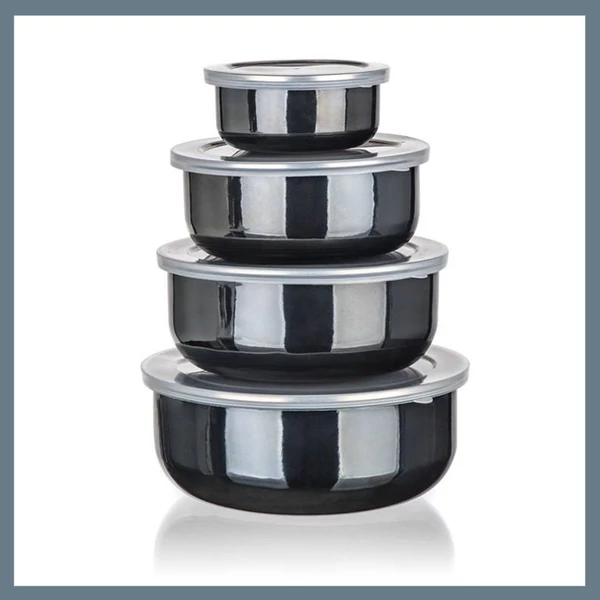 A szett 4 zománcozott tálat és 4 hozzájuk tartozó, jól záródó műanyag fedelet tartalmaz. A tálak átmérője 10,3 / 14,3 / 16,3 / 18,3 cm, térfogatuk 0,2 / 0,6 / 0,9 / 1,3 liter, így különböző tárolási igényekhez is ideálisak. A zománcozott felület tartós és könnyen tisztítható, azonban a készlet kizárólag tárolásra alkalmas – főzésre, mikrohullámú sütőbe, sütőbe vagy mosogatógépbe nem tehető.