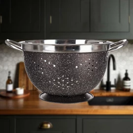 GRÁNIT rozsdamentes acél szűrőedény 25,8 cm átmérővel szürke színben, falvastagság 0,4 mm, magasság 15 cm. Használhatja a szűrőt zöldségek öblítéséhez, tészta szűréséhez és sok más ételhez. A szűrőedény praktikus állvánnyal és fogantyúkkal van felszerelve a könnyű kezelés érdekében.