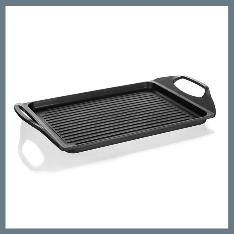 A 45 x 27 x 2,3 cm méretű grillező tálca két rétegű, nem tapadó felülettel rendelkezik, és tökéletesen alkalmas sütésre és grillezésre tűzhelyen, sütőben vagy kültéri grillen. Kiválóan használható steakek, halak, kolbászok, zöldségek, tojások és palacsinták elkészítéséhez. A tálca praktikus fogantyúkkal van ellátva, hogy megkönnyítse a kezelhetőséget. Ha gáz tűzhelyen használjuk, fontos, hogy lángelosztókat alkalmazzunk.