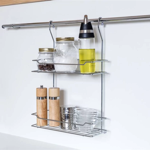 A VARIELLA kétszintes, 30 x 12 x 42 cm méretű függőpolc krómozott fémhuzalból készült, alkalmas például fűszerek tárolására. Az akasztódrót program termékei lehetővé teszik, hogy mindent a szemünk előtt tartson és kéznél legyen.