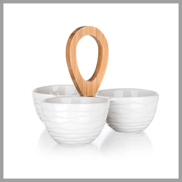 Kerek osztott porcelán tálak bambusz tartóval, 24 x 24 x 18,5 cm méretű. A tál ideális különféle diófélék, szárított gyümölcsök, olajbogyók stb.