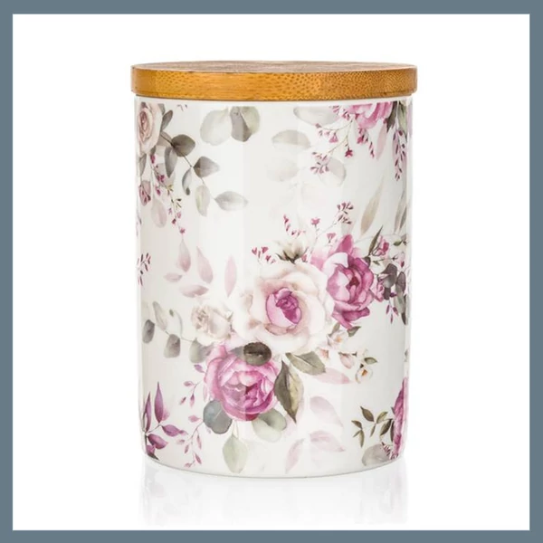 A BANQUET ROSE kerámia tárolódoboz elegáns rózsamintás dekorációval készült, amely stílusos és praktikus kiegészítője lehet a konyhának. Mérete: 13 cm átmérő, 10 cm magasság, így ideális élelmiszerek, például cukor, kávé, tea vagy egyéb alapanyagok tárolására.