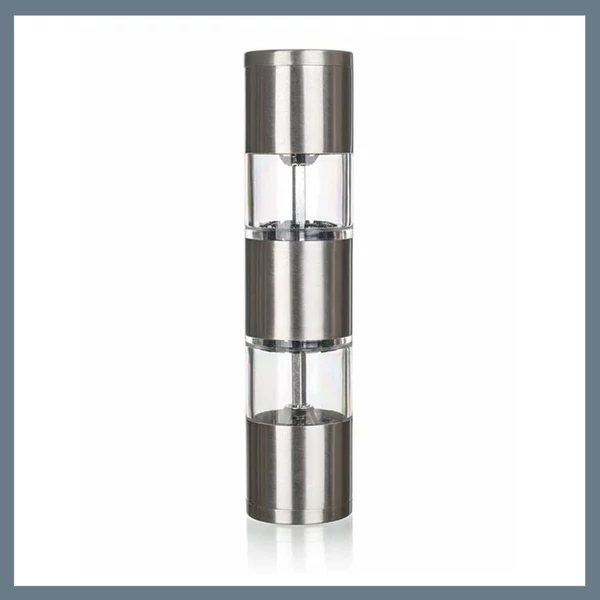 Só- és borsőrlő rozsdamentes acél kivitelben, akril tárolókkal és kerámia őrlőmechanikával. A praktikus 2 az 1-ben rendszer lehetővé teszi, hogy egyszerre tartsd kéznél a sót és a borsot. A belső őrlőmechanizmus garantálja a tartós és pontos őrlést. A fűszerőrlő magassága 19 cm, átmérője 4,5 cm. Az őrlés finomságát személyre szabhatod a beállításokkal.