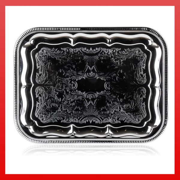 Négyzet alakú tálca 41 x 31 cm AKCENT, krómozott fémtálca dekoratív gravírozással, anyagvastagság 0,35 mm.