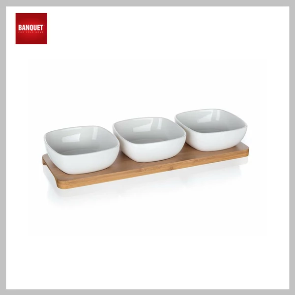 A 3 db, 33 x 9,7 x 4,7 cm méretű, bambusz tálcán lévő négyzet alakú porcelán tálból álló készlet ideális különféle diófélék, szárított gyümölcsök, olajbogyók stb tálalására.