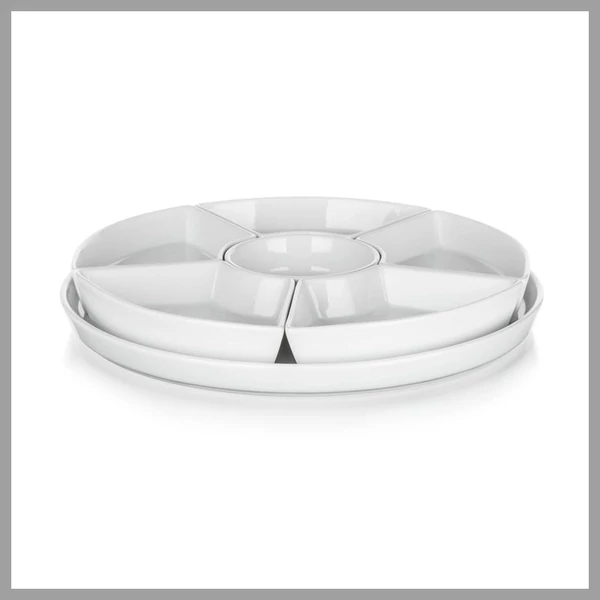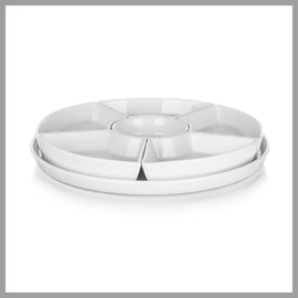 A BIANCA fehér porcelán tálalókészlet kerek tálcából és 6 különböző formájú tálból áll. Ennek a készletnek a felhasználási területe széles. A tálcát szendvicsek, szendvicsek, sütemények, torták vagy mini torták tálalására használhatja. Különféle mártogatósokat, lekvárokat, szórásokat, diót, gyümölcsöt vagy zöldséget külön-külön kis tálkákba tehet. Alkalmas mindennapi használatra. A készlet mosogatógépben mosható.