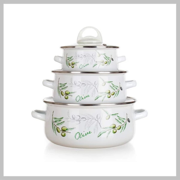 A Banquet zománcozott edénykészlet elegáns olajbogyó mintájával nemcsak praktikus, hanem dekoratív kiegészítője is lehet konyhájának. A 6 darabos készlet különböző méretű fazekakat tartalmaz fedőkkel, így ideális választás a mindennapi főzéshez. A tartós zománcozott bevonat biztosítja az egyenletes hőelosztást és a hosszú élettartamot, miközben megkönnyíti a tisztítást.